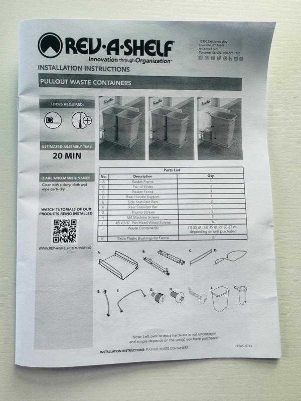 I absolutely love these Rev-A-Shelf pull-out trash containers! As always, Rev-A-Shelf delivers outstanding quality. The directions mentioned it would take about 20 minutes to assemble, but I’m a 44-year-old woman and had it fully assembled and installed in less than 10 minutes. The instructions are clear and straightforward. The screws and hardware are thick and of solid quality. I installed this under my kitchen sink for recycling purposes, and it has been a fantastic addition. The double 27 quart cans provide plenty of room to separate cans and glass. I can't recommend this enough for anyone looking to add convenience and organization to their kitchen!