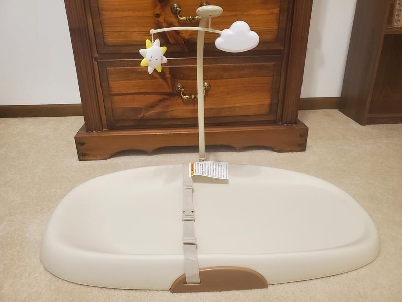 Love: Easy to clean Nice size Cute style Doesn't move around Don't like: Metal bar under pad, it arches baby's back. While baby doesn't seem irritated but looks uncomfortable positioned Top head section is a little too bulky, baby's head sits too far up and chin is to chest so you have to make sure you put head a certain distance to the top Also if you're tall (hubbys) then when leaning over you will hit your head on the decor ba